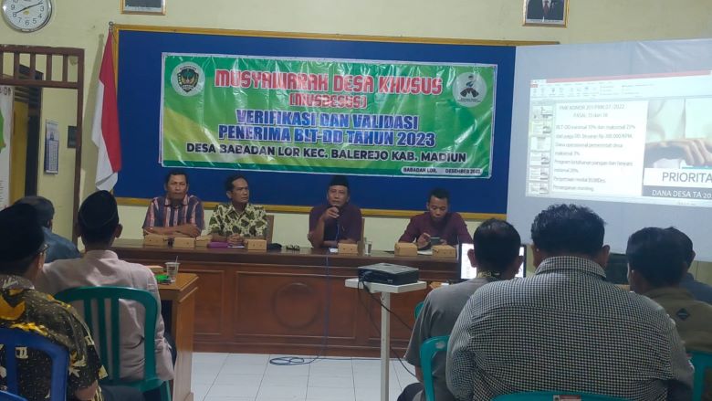 Pemerintah Desa Babadan Lor menggelar Musdesus Verifikasi dan Validasi calon KPM (Keluarga Penerima Manfaat) BLT-DD tahun 2023. Bertempat di ruang pertemuan Kantor Desa Babadan Lor, Kamis malam (29/12/2022). Hadir dalam kegiatan tersebut Kepala Desa Babadan Lor beserta perangkat, Ketua BPD dan anggota, Pendamping Kecamatan dan Pendamping Lokal Desa (PLD), LPKMD, Ketua RT serta tokoh masyarakat.